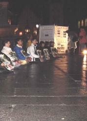 大法弟子打出了呼吁中国政府制止江泽民等犯罪分子杀害无辜大法弟子的横幅标语,手捧被迫害致死的大法弟子遗像,在普渡、济世音乐伴随下悼念被迫害致死的大法弟子。