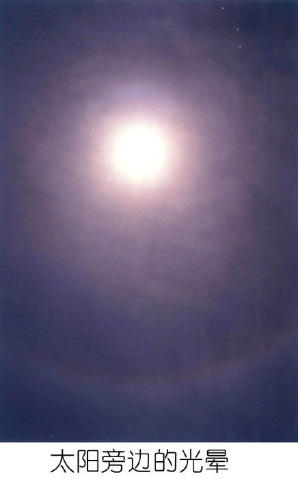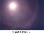 两个光圈都是内侧为红色,以彩虹光谱的顺序向外围过度。内环十分完整,整个内环区内天空颜色较深。外环的下方较清晰,越向上越淡,直至消失在天空中。外环区内由外环向内环,天空的颜色由深至浅均匀退晕。由外环至内环的距离与由内环至太阳的距离基本相同,比例关系与法轮图形的内圆、外圆一样。如果以外环直径计算,整个光晕的面积约占整个天穹的1/5,中心的太阳又格外灿烂,真是蔚为壮观。