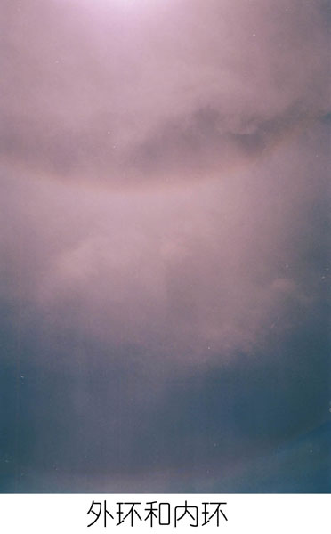 我们临时找来了一部简易的相机,拍下了这个动人的景象,虽由于太阳强光的影响,不能如实反映天空的颜色,但也可将美丽的光圈与全世界同修分享。照片洗出后,我们意外的发现在太阳的旁边还有一个小彩虹,这是在强光下肉眼无法看到的。(详见附图)