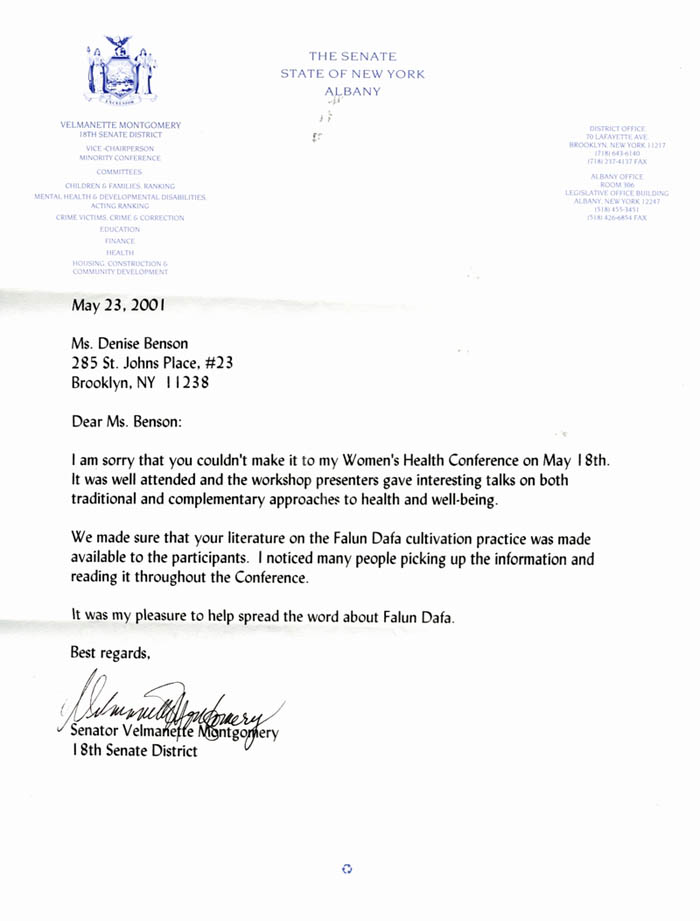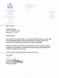 纽约州18区州参议员致法轮大法学员的信 【明慧网】
