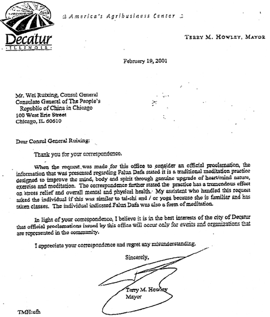 当地充当领馆的喉舌的一家华语报纸三月九号声称“美国伊利诺州迪凯特市市长豪利因误导而宣布“法轮大法周”向中方道歉。中国新华社3月7日更是出格地发挥并登出了题为“美国迪凯特市市长就宣布‘法轮大法周’一事道歉”的“华盛顿”谣言,谎称豪利市长致函中国驻芝总领事,说自己读了中国总领事来信和有关资料后,知道自己上了当,很快给总领事回信表示感谢,同时对自己不明就里宣布“法轮大法周”一事表示道歉。”(光明日报 薛福康 2001-03-09)(注:原件https://news.xinhuanet.com/china/20010309/420197.htm )
