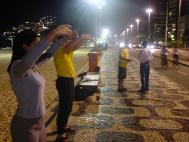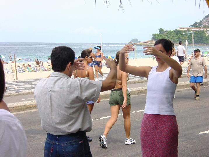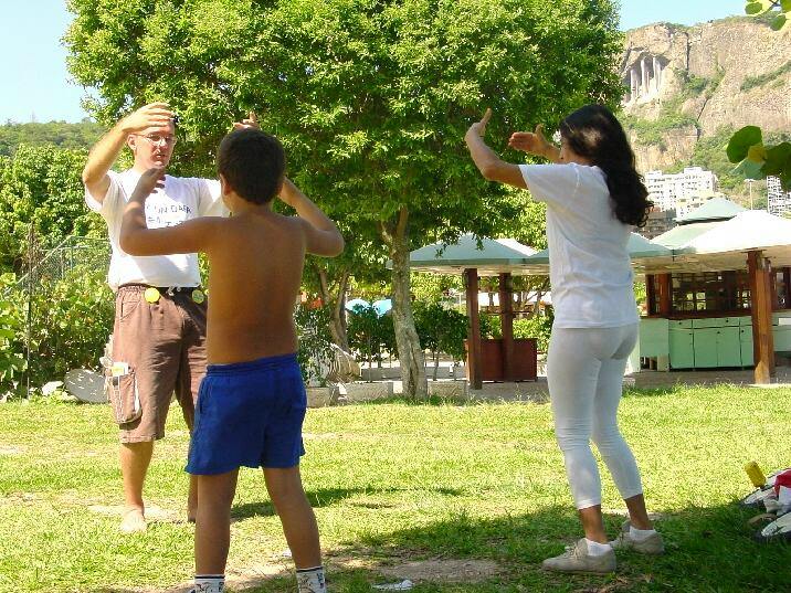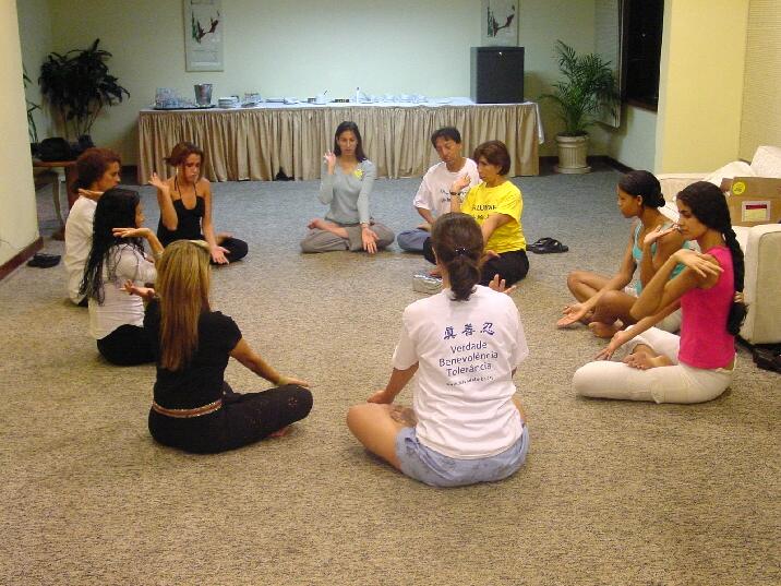 一到圣保罗的公园,我们开始寻找一个炼功和教功的好地方。我们注意到公园中有许多人都穿着白色T恤,这印证了我们认为我们选择的颜色将受到拉美朋友欢迎的想法。在珍奇鸟类栖息的美丽湖畔,我们注意到便道旁有一个水泥平台。那里空无一人,所以我们觉得这是一个炼功的好地方。我们放下垫子,打开炼功音乐开始炼功。在第一套功法结束时,有不少人在观摩我们炼功并询问问题。在第二套功法结束后,人越聚越多。等到第3套功法结束时,已经聚集许多人了。我睁开眼睛,注意到许多人都穿着印有蓝色字母的白T恤。开始我有些奇怪,等我走近观察才发现他们的T恤上印着另一个气功学校的名字。