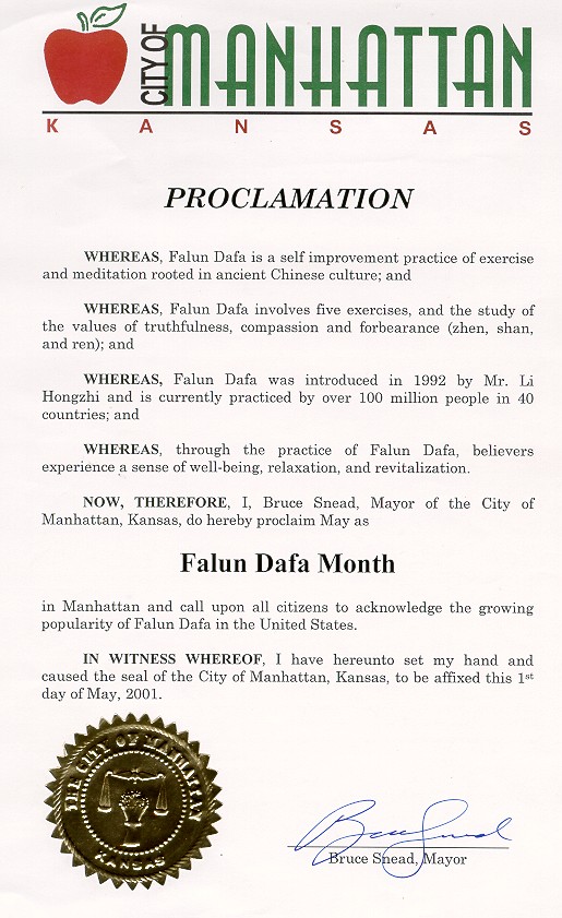 【明慧网2001年5月7日】堪萨斯州曼哈顿市宣布2001年5月为“法轮大法月”