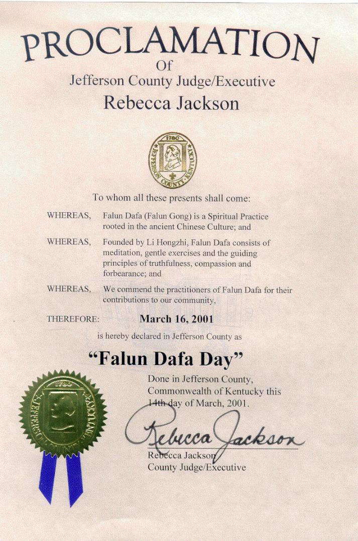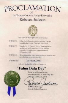 【明慧网2001年5月8日】肯塔基州杰佛逊郡宣布2001年3月16日为“法轮大法日”。