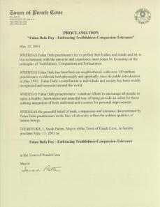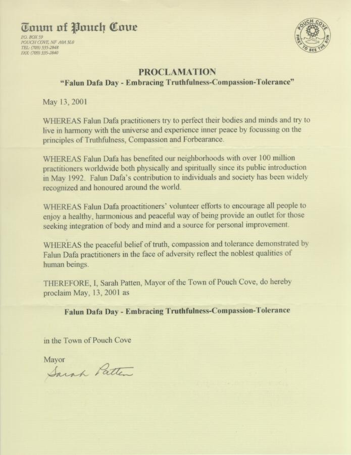 【明慧网2001年5月9日】加拿大纽芬兰省泊池柯夫镇宣布2001年5月13日为“法轮大法真善忍日”