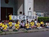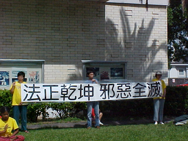 休士顿大法弟子于五月二十六日在中领馆前发正念时才经过暴风雨的洗礼,现又在五月二十九日在中领馆前经受火焰山高温的锤炼,真是天上人间考验一齐来,看其如何承受;然而休士顿大法弟子心中永存正念,他们不怕休士顿盛夏的骄阳,更不怕邪恶最后垂死的挣扎,他们与全世界大法弟子同时再发正念,铲除邪恶.真是:立掌乾坤震,正念显神威,“法正乾坤,邪恶全灭”的强大无比的正念一发出,有功能的大法弟子马上知道从身体内飞速射出串串法轮,它们是神弹,是神器,直接射向邪恶,有功能的大法弟子见到上空有威严巨大的佛,也与大法弟子同时立掌除邪恶,正如师父在2001年加拿大法轮大法修炼心得交流会上的讲法中第四段末尾话:”不只是你们清除,如果修炼人清除不了,那神、直至更高的神,也要参与清除。”天上人间的善与恶的交战非常激烈,然而邪恶只剩下了一层人皮。休士顿大法弟子决心乘胜追击,彻底根除三界内一切邪恶。