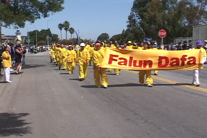 在悠扬的普度、济世音乐声中,我们打着“法轮大法”的横幅,开始了游行。在这盛大的游行队伍里,有老兵们扛着老步枪和国旗的正步行进,有人扮演的大黄蜂在微笑,孩子们的天真的脸上,洋溢着难以压抑的快乐,似乎分享着学员们助师洪法的喜悦。我们近20位学员,就在人们的热烈的关注与掌声中,缓缓地展示着殊胜的功法。