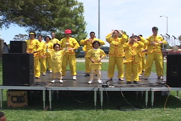 当我们的队伍行进到主席台前时,主持人向观众介绍了法轮大法的简介,我们又向路两旁的人们展示了动功功法。无声的慈悲的场,抓注了人们的心,我们也为人们能有缘接触到法轮大法而高兴。