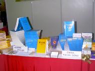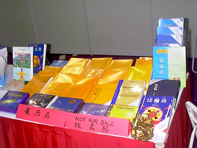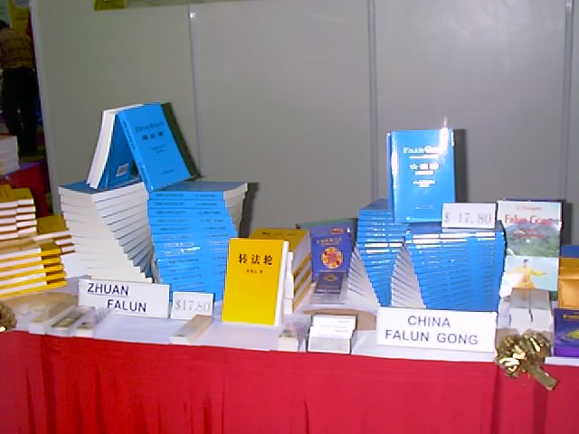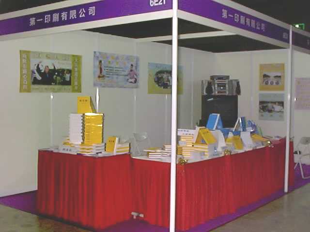 我们的展台位于六楼,背景布置了三幅大型的各种族大法弟子炼功的海报,‘法轮大法’‘真善忍’的中英语标题十分醒目。另一面挂着师父的教功动作图解。台角摆放着大屏幕电视,轮流播放中英文教功录像带和‘法轮大法在台湾’的节目。台前的展桌上摆放着供售卖的《转法轮》、《法轮大法大圆满法》、英语版《转法轮》和《中国法轮功》,还有十多本师父的其他著作、《转法轮》的多语种版本和大法音像制品等供读者取阅。另有几款中英文大法书签和大法年历排成优美的扇形免费赠于参观者。同一楼层的其他展台都是经销保健、艺术品及开展文艺活动的,摊主们播放着流行歌曲,推销健身药品,或是作画刻章。在嘈杂和忙碌中,法轮大法的展台显得简洁宜人,别具一格。录音机中传出悦耳的普度音乐,犹如一股清泉,叮叮咚咚地沁人心脾。为了这次书展的成功,全体大法学员都全力支持参与。一位六十七岁的退休美术教师设计了展台的布置,并连夜赶制了精美的红色桌子围布和点缀用的花朵。学员们排好值班表,一个个衣着整洁庄重地出现在展览厅,微笑着面对每一位走过的顾客。法轮大法以这样的方式和形象参加国际展览是对在本地修炼法轮功合法性的有力的证明。