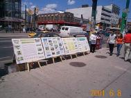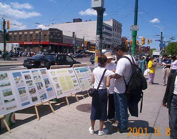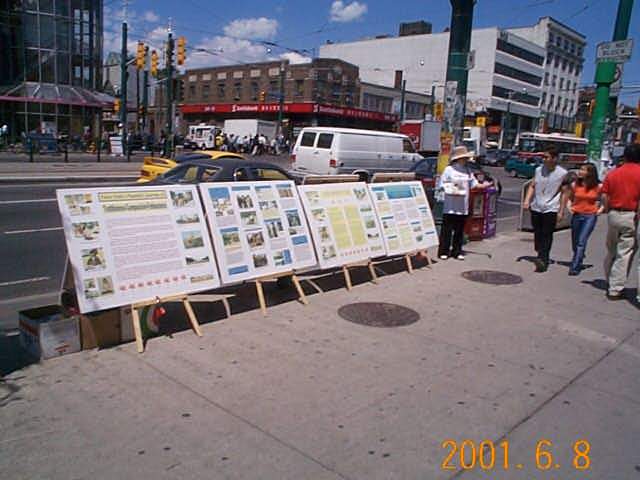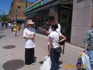 师父在今年加拿大法会讲法中告诉我们:“而在这场邪恶的破坏中,华人是受害最深的。”法会以后,多伦多弟子加强向华人洪法讲清真相,把在中区唐人街一周三次〔星期五,六,日〕的洪法活动改为每周七天,每天从中午12点左右到晚上7-8点,摆放大型大法图片展板和派发大法资料及征集签名。