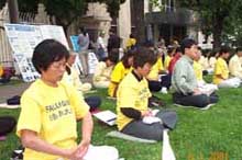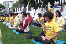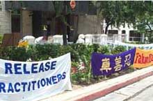 今天的活动除了照例反复演炼五套功法外,每炼一套功法前,都增加了“发正念,清除邪恶”活动。开了天目的学员看到,中领馆前确实很邪恶,刚一坐下,一群群的恶魔就向学员扑来,这些魔多数是动物形像,有的还穿着人的衣服。一群小鬼挤在一辆车上冲过来,学员刚一做立掌的动作,它们就消失得无影无踪了。