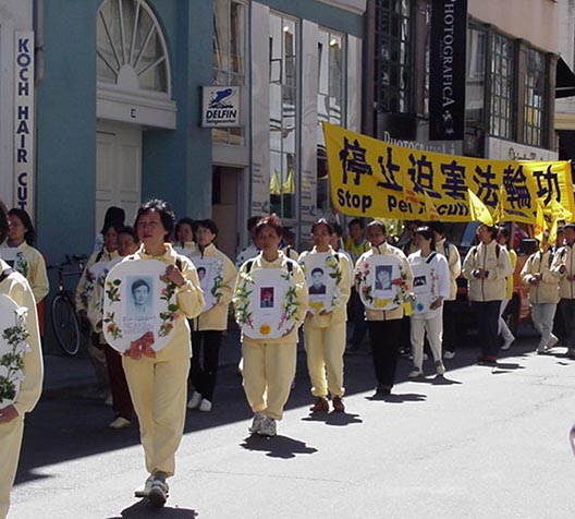 以”悼念被迫害致死的大陆学员及停止虐杀”为主题的游行,从新广场开始,横穿市区,经走街园塔,至国王新广场结束。身穿浅色衣服的女学员手捧被迫害致死的学员的照片,庄严肃穆的走在前面,引起了沿途观众的关注和询问。当了解到迫害真相后,许多人都在呼吁书上签名,并询问如何提供帮助。沿途学员同时还派发了许多真相传单。