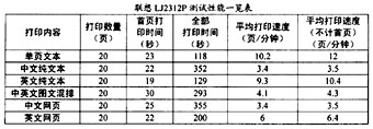 办公打印对打印机的速度要求是比较高的。联想LJ2312P在这方面表现非常出色。LJ2312P采用了BROTHER的打印引擎,配有2MB的标准内存,标称打印速度为每分钟12页。由于影响打印机打印速度的因素很多,如打印机的引擎速度、打印机内置控制器的性能、驱动程序性能、计算机处理能力、分配给打印作业的内存、通讯接口类型和性能、纸张大小、打印内容和图形质量等。因此我们给出了测试环境的具体配置:赛扬300ACPU;64MB内存;6.4GB希捷硬盘;操作系统为Windows98中文版。测试中使用了打印机的并口连接,同时设置为ECP方式。整个测试过程关闭了所有打印作业之外的进程;采用70克普通复印纸。打印质量设置为600dpi,其他选项同样均设置为打印机驱动的缺省默认值。由于打印机存在预热时间,因此首页打印时间会相对较长一些。为此,在记录打印速度时,同时记录首页打印速度。首页打印速度为按动打印确定按钮开始到第一页纸完全从出纸口吐出的时间;打印全部完成时间为按动打印确定按钮到最后一页完全从出纸口送出的时间。