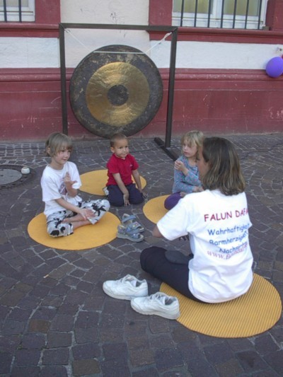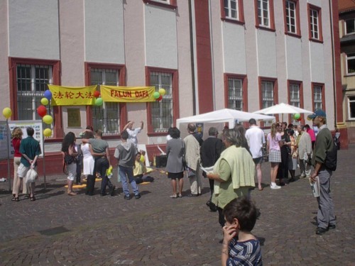 在德国所有和纳粹标志相似的图形都是禁止在公开场合展示的。两个身着便服的士兵看到了法轮图形,没看一眼文字说明就把警察叫来了。警察和海德堡的外事负责人来了。那个外事负责人非常激动,说我们得把摊位撤了。当几个炼功人过来时,他们听到一个过路的女士正对警察和外事负责人说:“这是一个有两千五百年历史的佛家符号......。“还有几个过路人为我们据理力争。一个弟子看到这个情景于是开始发正念。其他的弟子耐心地用图片解释卍字符的历史。那个外事负责人的声音越来越低。最后他只把法轮图形和一篇介绍卍字符的文章拿走了。