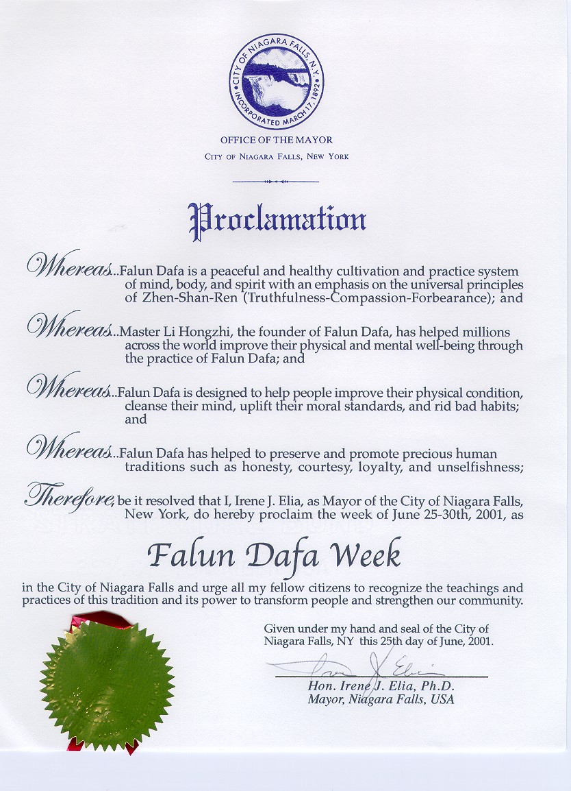 【明慧网2001年6月29日】纽约州尼亚加拉瀑布市宣布2001年6月25日至30日为“法轮大法周”