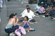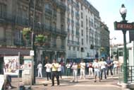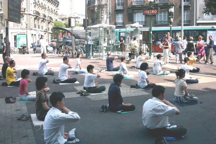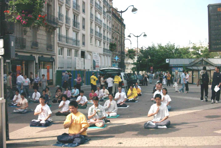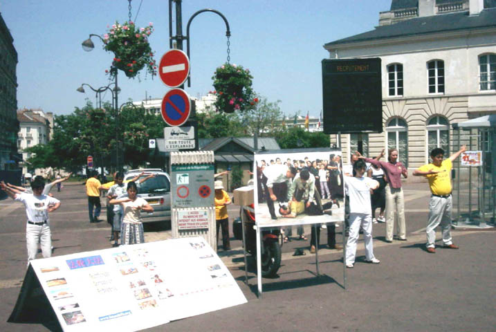许多行人路过领事部,再来到广场见到祥和的洪法场面,纷纷对学员们说:“看样子,他们真是怕你们怕得够呛啊!”“你们知道吗,那些(包围领馆的)警察是在保护你们呢。”有的来领馆办手续的华人说:“江XX在搞什么鬼?!”一位女士看了法轮功学员在中国所遭受的迫害的展版,拍了拍学员,说:“耶稣会管的。”一位先生看完了学员散发的“SOS营救法轮功学员”的资料后表示他一定会和学员联系,帮助在中国遭受野蛮迫害的法轮功学员。一位华侨耐心地等待学员们做好布置准备工作,因为她听说法轮功简单易学而有效,所以一定要看看炼功。一个自学中文的小伙子拿了所有中、法文的洪法资料。