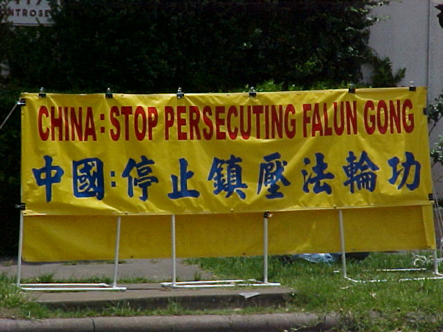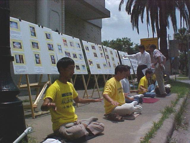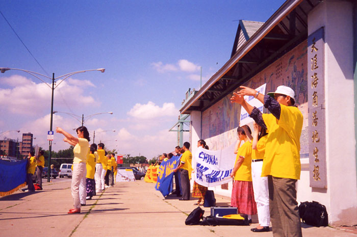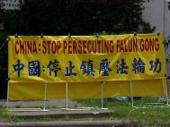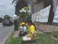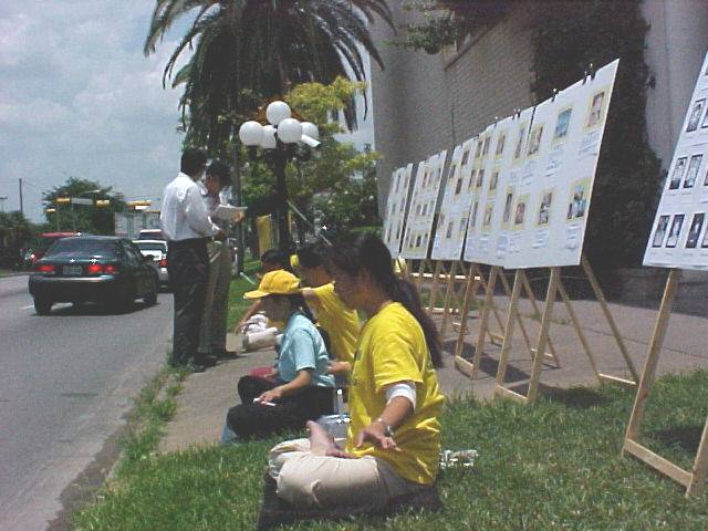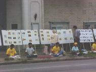 约十多位法轮大法信息中心的代表于下午一时开始,在总领事馆门前展出遭受中国大陆当局镇压的法轮功学员相关资料,其中包含多位受到刑求者的照片和被害者的照片。他们也在现场分发资料和录影带,向记者及路人指控中国大陆当局的「邪恶镇压」。