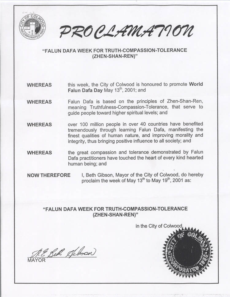 【明慧网2001年6月4日】加拿大不列颠哥伦比亚省考伍德市宣布2001年5月13日至19日为“法轮大法真善忍周”。