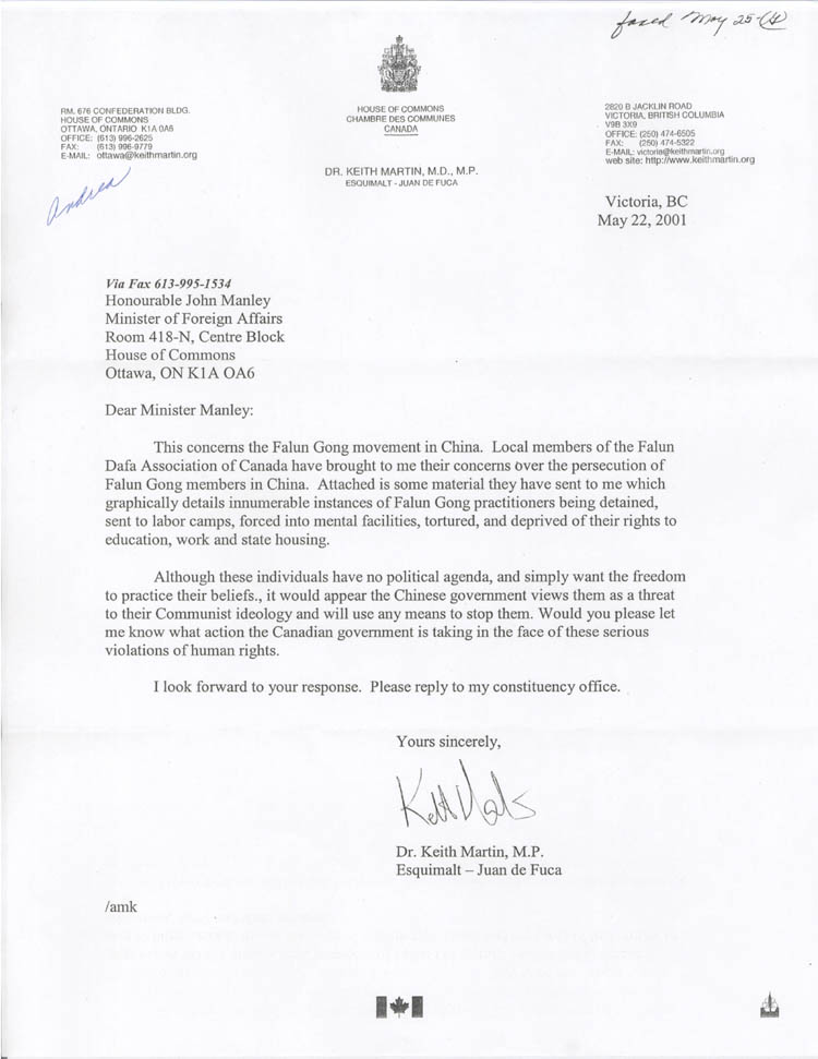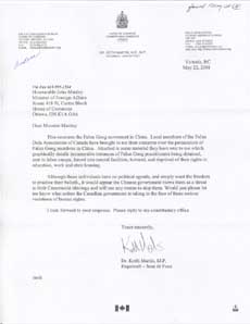这封信与中国的法轮功运动有关,当地法轮大法学会的成员向我表达了他们对正在中国发生的对法轮功成员迫害的忧虑。随信附上一些他们向我递交的材料,这些材料生动地描述了众多的关于法轮功修炼者被拘禁,被遣送劳教所,被强制精神治疗,被酷刑折磨,被剥夺受教育和工作的权利及国有住房的事例。