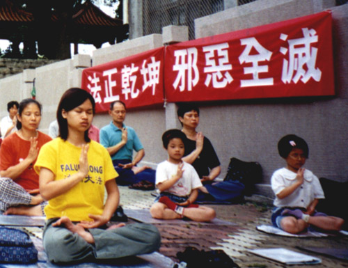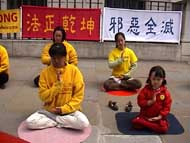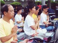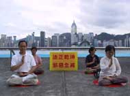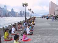 | 70多名学员在尖沙咀海滨公园齐心合力清除邪恶 | 学员在尖沙咀海滨公园发正念 | 三十多位学员在中联办外发正念 |