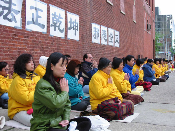 江泽民流氓集团丧尽天良地迫害法轮大法已近两年,不断有大法学员被抓,被打,被迫害致死,包括一些海外回国的大法学员。国内的学员上访无门,伸冤无处。我们国外的学员理所应当地去中国使馆请愿,强烈要求中国政府制止被大赦国际评为“人权流氓”的江泽民的犯罪行为,立即释放所有被抓的大法学员,还李洪志师父清白!芝加哥大法弟子现在几乎天天去中共领馆和平请愿,极大地抑制了邪恶势力的嚣张,同时使更多的世人有机会了解了真相!周六下午,几十位大法弟子如往常一样赶赴领馆炼功请愿,一部分学员从图片展直接去领馆,也顾不上吃中午饭。不管刮风下雨,请愿活动雷打不动。大家的心很定:只要不停止迫害,就不停止在中共使馆前的和平请愿!