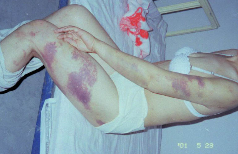 铐坐在铁椅子一边的女大法弟子被踢踹得坐在地上,头上被倒得全是药水,此恶警怕药水烧伤手,用横幅包缠住女大法弟子的头,将她又从地上提了起来,继续踢踹。就这样在派出所走廊内我们被轮流毒打了近一个小时,一办公室的门才打开,出来一干警说道:算了算了,别打了别打了,此恶警才住手。