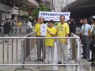 由晨早下起的滂沱大雨,延续到中午之后雨势不断,丝毫没有动摇学员的决心。由下午2:55-3:05,大伙整齐的坐到湿漉漉的地上,集体发正念铲除邪恶。学员随后宣读致中央政府领导人的公开信。一名原居于深圳最近因派发真相资料被拘禁一个月的香港学员,向媒体揭露了看守所里的非人待遇和对外弄虚作假的真实情况。