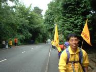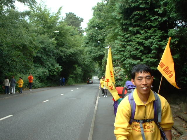 七月八日,是英国伯明翰至伦敦sos"紧急救援法轮功学员"长途步行的第一天。刘雪枚一行已完成了三十公里的步行,到达Bromsgrove镇。在一天的步行中,他们行装上的"SOS"、法轮功学员死亡人数、和英文的紧急救援法轮功学员的标语、字样,吸引了不少英国人。有过路司机向他们鸣笛致意,也有的人竖起大拇指表示“Good job!”(干得好!)。很多人主动上来,询问是否需要帮助,特别是这个小镇的警察,当他们得知英国学员此行的目的,看了大法资料、了解到中国发生的暴虐后,对大法弟子产生了由衷地敬意,主动为他们联系住处,临别前,还特地要了些大法资料,表示要在当地警处摆放。也有看过不少大法资料的英国人,在此巧遇大法弟子,紧紧握着学员的手,感慨地说:"大法,好啊!"步行学员们都感到英国各个镇上,真是有很多善良的人等待听到大法的声音,我们真要更努力才行啊!