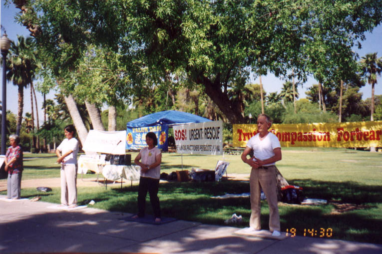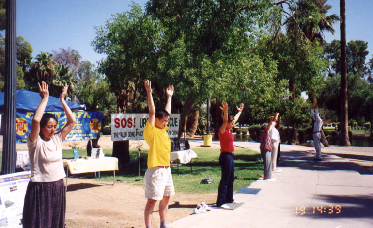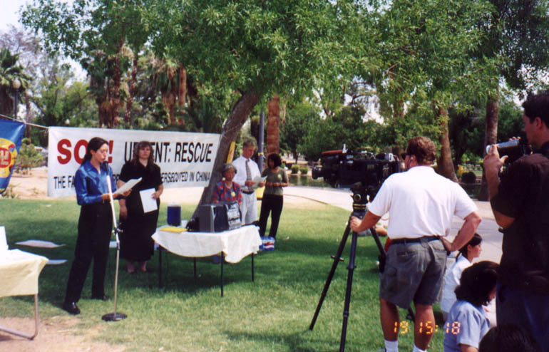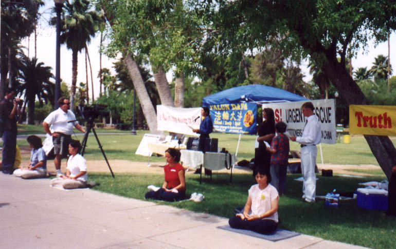 七月七日清晨,学员们来到位于凤凰城市中心的印坎多公园,冒着酷暑,开始控诉江泽民流氓集团的滔天罪行,并发出紧急救援在中国被残酷迫害的法轮功学员的呼吁。凤凰城主流媒体----NBC电视台采访了新闻发布会。
