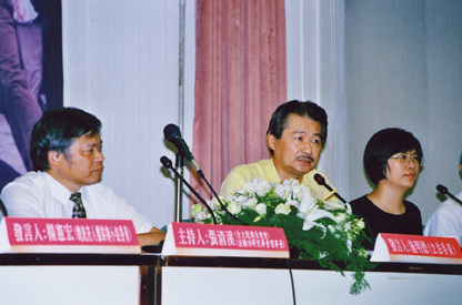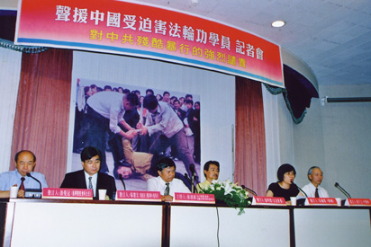 法轮功研究学会理事长张清溪首先发言:「今天沉重的召开记者会,主要是想揭发中国江泽民集团迫害法轮功的罪行以及希望引起台湾社会的关注,能够达到救援中国法轮功学员的这么一个目的。从九九年到现在,我们发现中国江泽民集团已经失控了,在劳教所,「打死了算自杀」已经算作一种口头语,政府人员这种执法违法的作为,全世界大概没有一个国家是这个样子。」