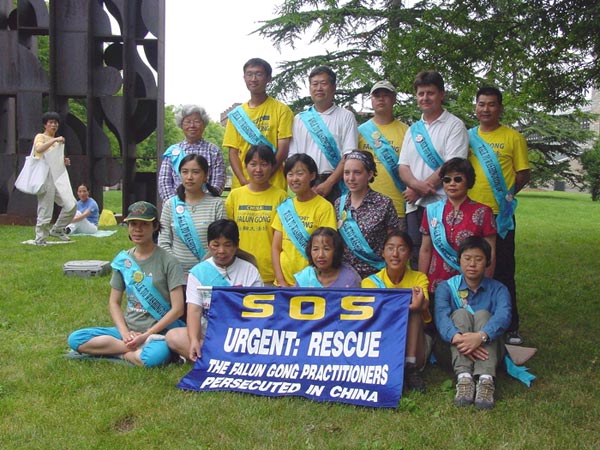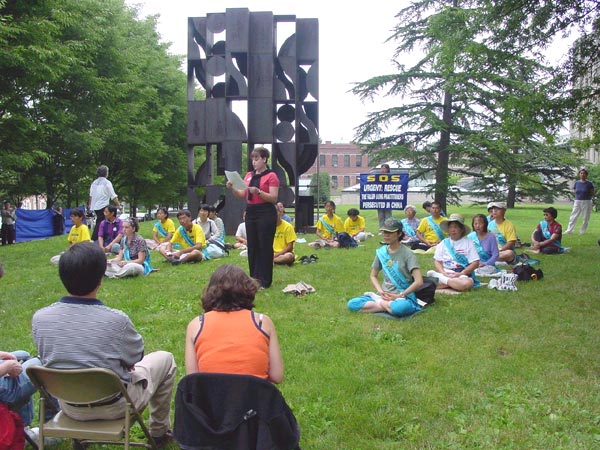 2001年7月8日早晨,纽约,新泽西,波士顿和康州sos紧急救援大陆受迫害的法轮功学员的步行队伍从新州富兰克林出发,冒雨继续向南行进。许多学员的衣服鞋袜被雨水淋透,但这丝毫没有减缓队伍的行进速度。中午,步行队伍到达普林斯顿市中心。学员们拉开了“紧急救援大陆受迫害的法轮功学员停止镇压”的大横幅,立起来大陆学员受迫害的图片展板。许多行人驻足观看和询问。学员们散发了许多传单和资料。下午一点,在普林斯顿大学校园图书馆前面的草坪上,召开了新闻发布会。当一位学员见证自己的弟弟由于不放弃修炼法轮功而遭受残酷迫害,另一位十九岁的美国学员将自己同中国大陆同龄女学员对比讲述自己为什么参加步行时,许多与会者被深深地触动了。会后,学员们进行了集体炼功和发正念。当地最大的媒体“川顿时报”的记者对步行学员进行了详细的采访和报导。