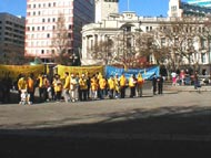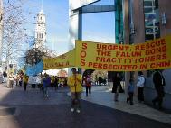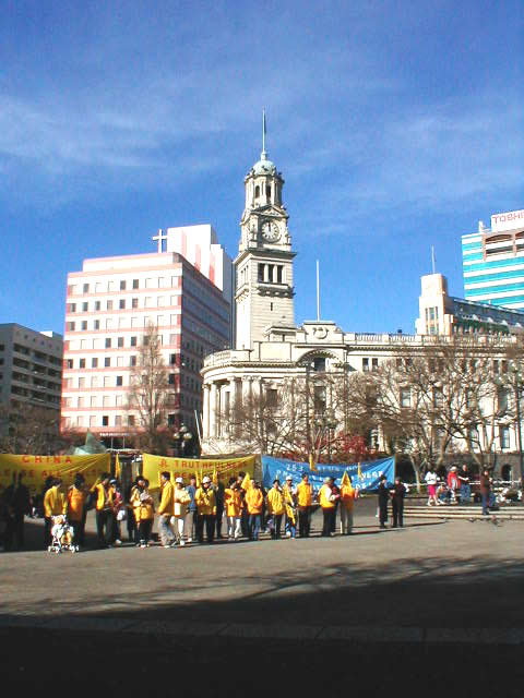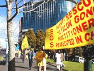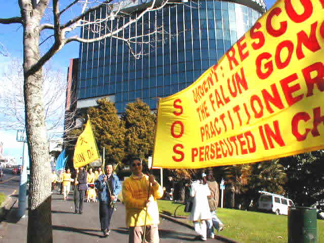 紧接着,学员们沿奥克兰市中心的皇后大道开始游行。由于新西兰发行量最大的日报《新西兰先驱报》在“今日要知道”的栏目中报道了此次游行的时间,路线,再加上又是午休时间,所以在路上行走和驻足观看的人很多。大法学员分两路在左右两边的人行道上同时行进。“中国,停止虐杀”、“紧急救援在中国遭受迫害的法轮大法修炼者”, “请帮助我们制止中国对法轮功修炼者的迫害”等7条横幅非常引人注目。学员们还举着多幅讲明真相的图板,打着印有“法轮大法”,“真善忍”的黄色三角旗,在“普度”、“济世”的乐曲声中行进。道路两边分别有几位学员向行人发放真相资料。许多行人主动伸手索要资料。一位年长的妇女上前拥抱着我们发资料的学员说“祝你们好运”。学员们不断地听到人群中传出:“做得好!”“好样的”的赞叹。很多路人听说了中国学员的悲惨遭遇后都表现出了同情,并且对江XX政府的做法表示很不理解。