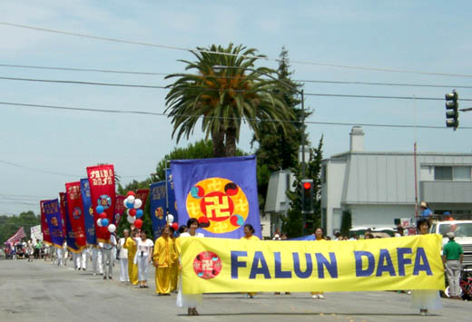 7月4日是美国独立日,在北加州湾区有多个城市举行了盛大的游行庆祝活动。圣荷西地区大约60多名学员参加了红木城的庆祝游行。由身穿黄色炼功服和纯白色服装学员组成的队伍特别引人注目。中英文书写的法轮大法横幅前头引路,大法轮旗跟随其后,中间是身穿白色服装,手执红、蓝、白色气球的学员队列,后面是制作精细的法轮彩旗,普度、济世大法音乐响彻云霄。