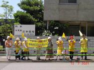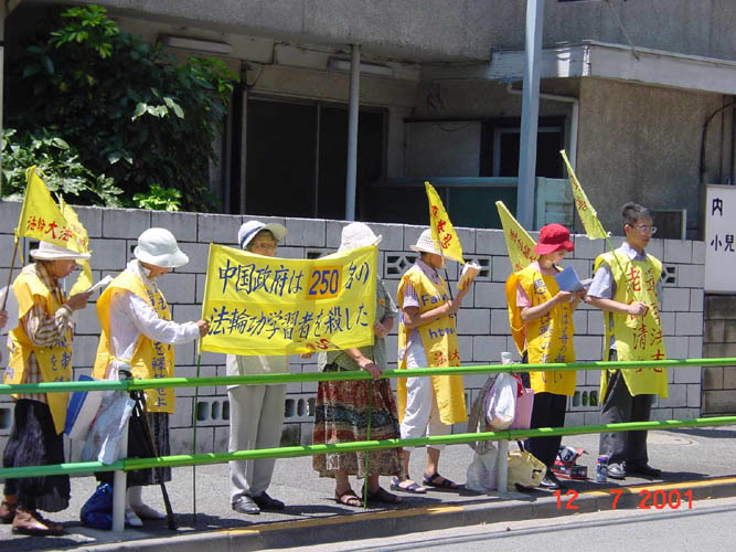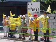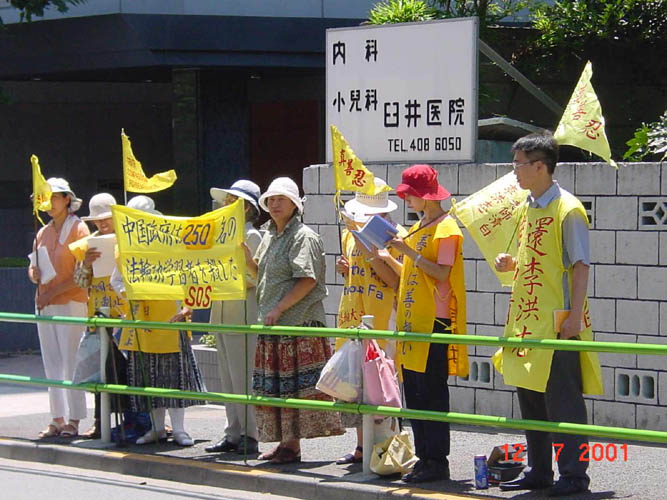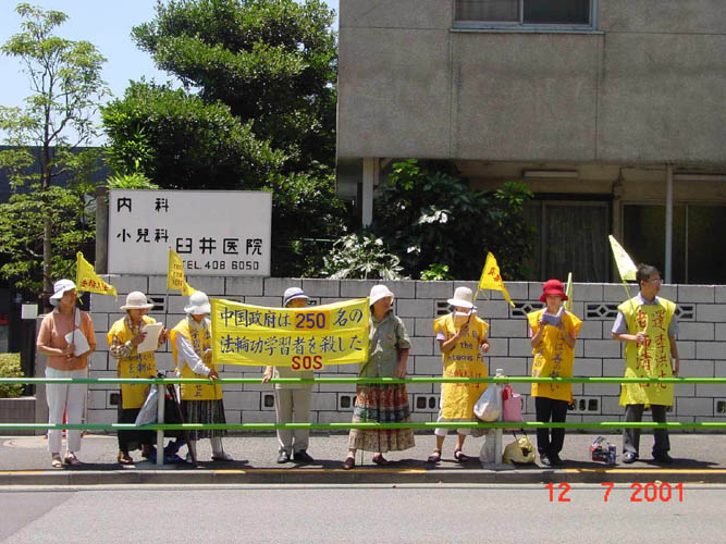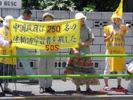 SOS!日本法轮功学员紧急呼救,制止江泽民犯罪集团虐杀法轮功学员。日本法轮功学员坚持在中国驻日本大使馆前和平请愿,呼吁紧急救援。