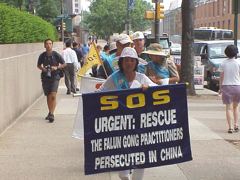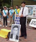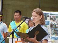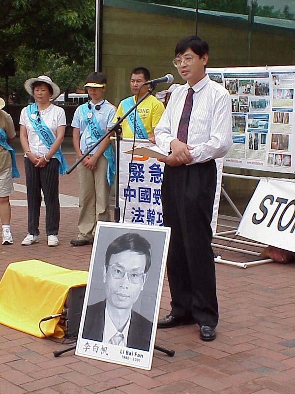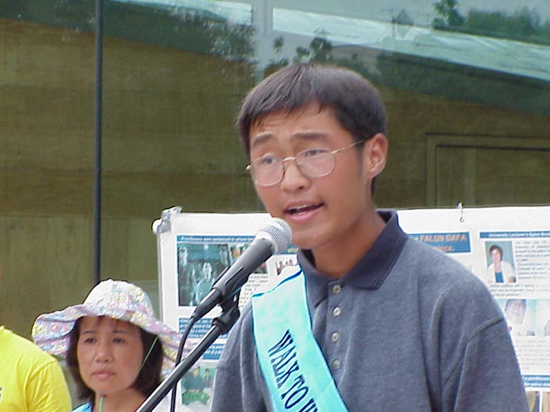 被致死的大法弟子李白帆的弟弟詹姆斯.李博士讲述了其兄受害的真相。被烈日晒的黝黑的16岁的步行学员汪浩发言,讲述他放弃假期打工度假却参与步行450哩的原因,谴责江泽民政府对法轮功学员的残酷镇压杀戮, 呼吁全社会给予支持紧急营救受迫害的法轮功学员。