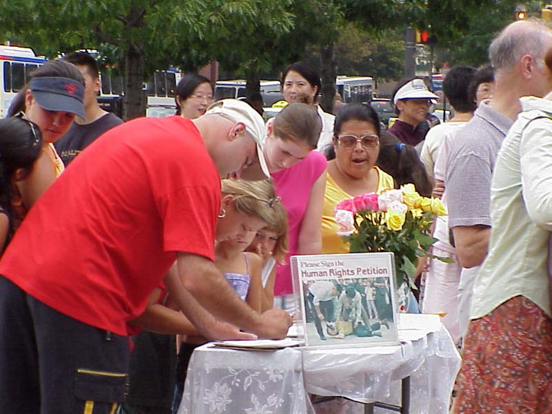 有不少游人驻足倾听并签名抗议中国(江泽民)政府对人权的践踏, 还有一些一直关注法轮功的善良人士特地赶来参加。