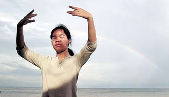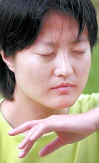 坦帕的一名学员张英在炼习法轮功时从不张开眼睛,她心中知道每一个细微的动作。