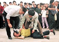 [美联社照片]2000年10月警察在北京天安门广场拘留一名请愿的法轮功学员。