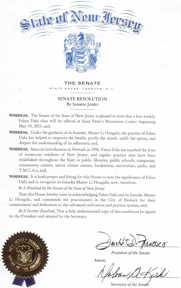 【明慧网2001年7月14日】新泽西州参议院决议嘉奖法轮大法及其创始人,并赞赏纽瓦克市法轮大法修炼者对此高层次修炼系统的坚定与投入。