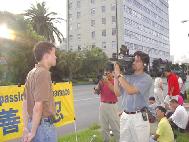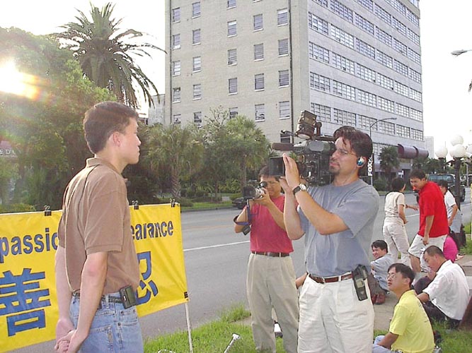 7月13日下午,休斯顿FOX26电视台在中领馆前采访了和平呼吁的法轮功学员,当记者问道中国江泽民当局为何如此残酷迫害法轮功学员,被采访的学员问答到,只因法轮功学员坚持对法轮大法真、善、忍的信仰,而江泽民当局剥夺他们信仰自由的基本权力,因此对他们实行大规模野蛮疯狂迫害,企图把法轮功镇压下去。接着,记者又问道法轮功学员为何宁死不放弃修炼法轮功,学员问答到,因为法轮大法不仅带给人们身体的净化,而且让人们懂得如何做一个高尚的人、通过修炼心性带来道德和精神的升华,巨大的身心受益使得他们宁死不放弃法轮大法的修炼。