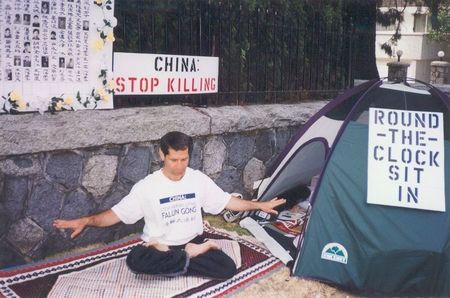 “我坐在这里,第一,是要告诉中国领事馆,告诉中国政府,随便杀人是不对的,杀修炼真、善、忍的法轮功学员更是不对。我想,领事馆的人也会有善心,希望能唤起他们的良知,正确认识大法,也是在救度他们;第二,我要告诉世人,中国杀害修炼真、善、忍的人,这不仅是对法轮功学员的杀害,也是对全人类美好心灵的杀害,等于是剥夺了人做好人的权利!我坐在这里,没有政治目的,就是要为世人争一个做真、善、忍的好人的权利!其实,世人都应该问一问自己:江泽民为什么敢如此逞凶,难道你没有责任吗?”