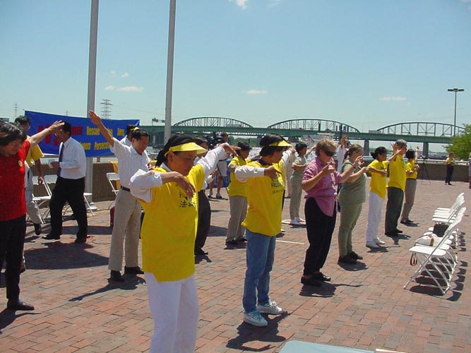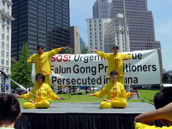 从加州横穿美国来到印地安那波利斯的法轮功学员在市中心烈士纪念碑广场炼功。报道说:他们不仅是做功法展示。他们的发言人说:我们希望寻求各种可能的办法制止在中国进行的迫害。
