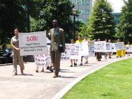 我们早上在杰佛逊大学公园里炼功,这是除纽约中心公园外,美国最大的公园了。她使我想起旧金山的金门桥公园,十分宽阔,而且还有博物馆,大会厅等等。今天是此行第一次我们做了完整的两个小时的动功和静功,我们都感到轻松愉快。祥和的炼功场面和醒目的横幅吸引着过往的行人和车辆,汽车为了看清楚我们的横幅和伸手要我们讲清真相的资料常常减速通过,有一个骑自行车的西方男士,特别过来向我们了解中国江泽民集团对法轮功学员迫害的真实情况。越来越多的美国人民开始对法轮功学员在中国的迫害情况表示关注。而我们开来的写有“紧急救援法轮功学员”字样的汽车则在市中心附近行驶,把我们的信息传递给这里的人民。