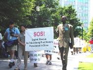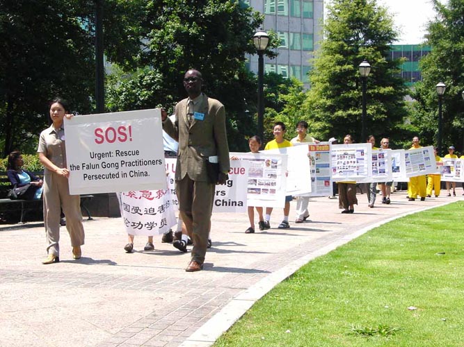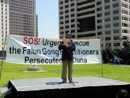 中国刚刚获得2008年的奥运会主办权。这些法轮功练习者在提醒美国人关注在中国对法轮功群众的迫害和杀戮。发言人说:“在一天的时间里,有15名法轮功炼习者在中国的劳教所被迫害致死。”