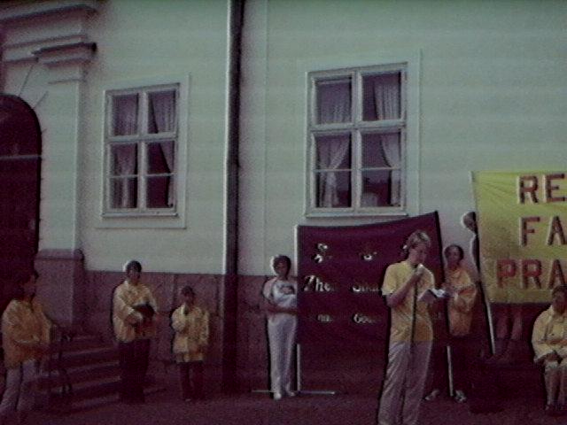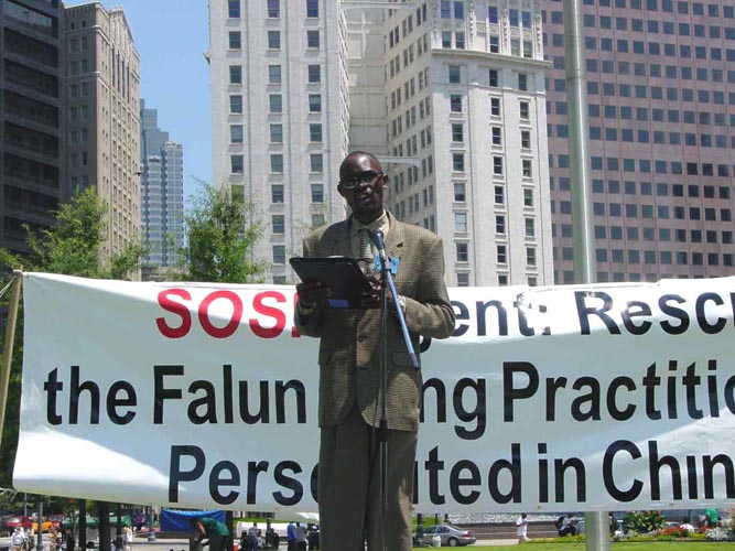 “我坐在这里,第一,是要告诉中国领事馆,告诉中国政府,随便杀人是不对的,杀修炼真、善、忍的法轮功学员更是不对。我想,领事馆的人也会有善心,希望能唤起他们的良知,正确认识大法,也是在救度他们;第二,我要告诉世人,中国杀害修炼真、善、忍的人,这不仅是对法轮功学员的杀害,也是对全人类美好心灵的杀害,等于是剥夺了人做好人的权利!我坐在这里,没有政治目的,就是要为世人争一个做真、善、忍的好人的权利!其实,世人都应该问一问自己:江泽民为什么敢如此逞凶,难道你没有责任吗?”