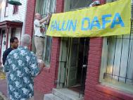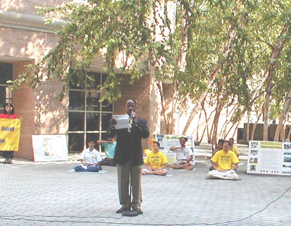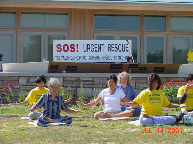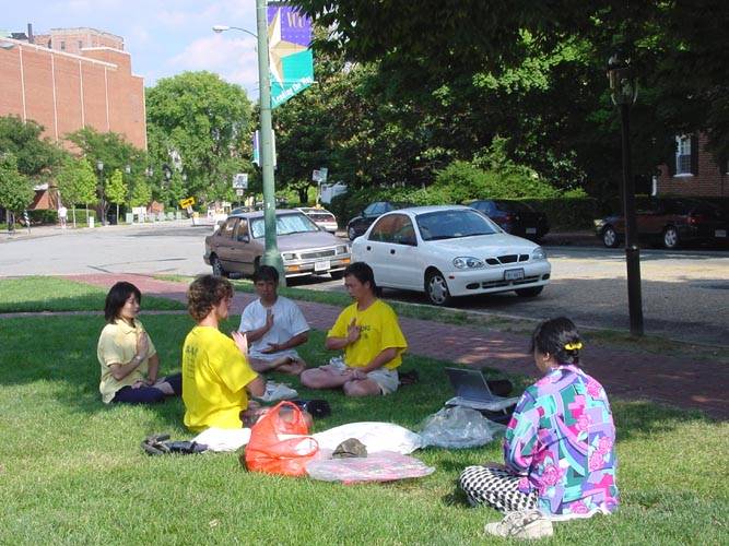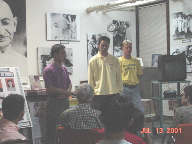 在新闻发布会上我们宣读了一份声明,两份来自政府的褒奖,一份李洪志日的褒奖,一份印第安那泊里斯市褒奖,还有一位大学生关于他的母亲在中国被关押的陈述。整个会议期间,学员们一直在打坐。