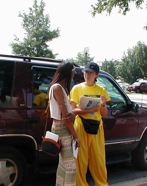 在发放资料时,学员被多次问到有无签名的表可签名表示支持。有些人心地非常好,一位一直与他的同事一起听发布会的中年男士后与一位学员交谈很长时间,他的问题一个接一个,我们学员趁此机会详细、清楚地向他讲清真相,他最后真诚地说,我真想有什么好办法能帮助你们。我们这位学员很感动,大法的威力使他发自内心地支持法轮功,这颗心是多么珍贵呀!