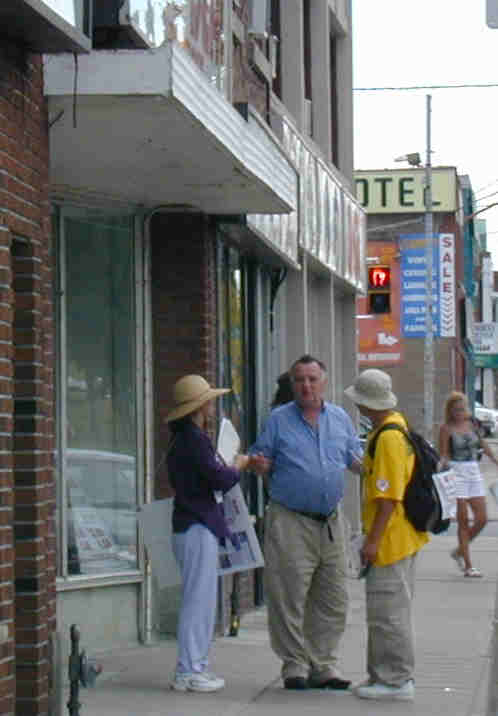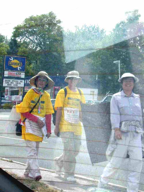 第5天,7月15日,晴。我们和当地学员一起沿着较为繁忙的安大略湖滨大道横穿拥有六、七十万人口的密西索佳市。皮肤被火辣辣的太阳乾烤着,但是学员身上贴近背包和小展板的衣服却被汗水湿透了。大家轮流举着横幅标语面向着过往车辆。其他学员向行人及路边的店铺餐厅或信箱派发传单。