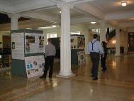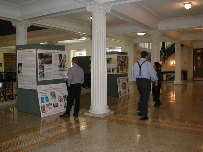 在图片展的次日,我们在州政府大楼二楼的NurseHall进行了一天的功法展示并多次发正念。我们还在一张桌子上放上《转法轮》、《法轮功》供有缘人阅读,放上揭露邪恶的各种信息资料任人索取。由于正值暑假期间,有不少夏令营的青少年来州政府参观,也看到功法展示和图片展,我们将SOS传单分发给每一位路过的人。我们也同时连续播放“天安门自焚真相”、“真实的故事”等录像,让人们能了解到江泽民集团为了迫害法轮功可以疯狂残忍到何种程度。学员们平和宁静的炼功场面与图片中展现的警察暴力形成了鲜明的对照,谁正谁邪一目了然。