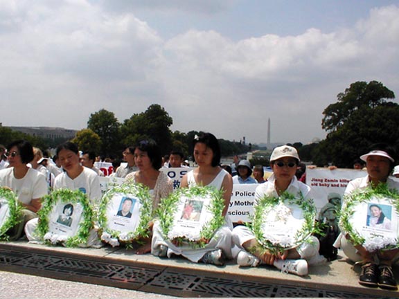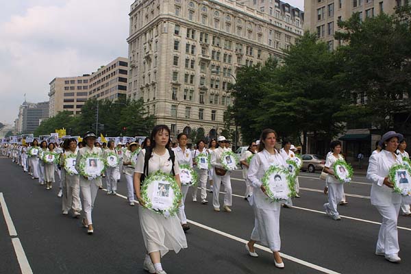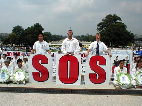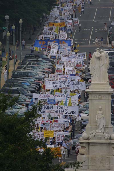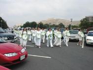 游行开始前,大法弟子宣读了一份英文的声明,声明中说“一个修炼真、善、忍的和平团体,他的成员仅仅因为坚持自己的信仰,就要冒着失去前途、自由乃至生命的危险,铺天盖地的谣言和惨烈严酷的刑罚却不能丝毫动摇他们对真理和正义的坚定信念。鲜血让我们擦亮眼睛,良知让我们不再沉默,今天我们相聚华府,为了呐喊出他们在中国被压抑的声音:紧急求救,请援救在中国被迫害的法轮功修炼者!现在我们从象征自由的独立纪念碑出发,让全世界正义的力量从这里开始汇聚成滚滚洪流。”